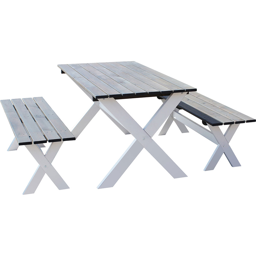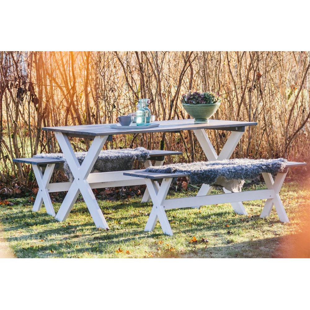 Ett bänkbord i kraftig konstruktion, perfekt för trädgården. Bordet levereras transportmålat och toppstrykt en gång.