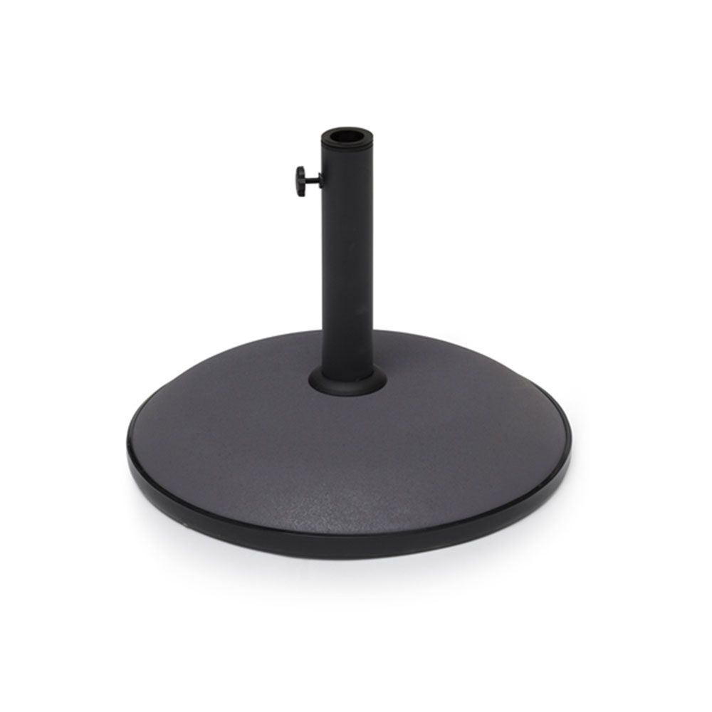 Parasollfot i grå betong. Plasthylsor i röret gör att diametern kan justeras mellan 30 och 50 mm. Plastlisten gör att betongfoten kan förflyttas med mindre risk för repor.