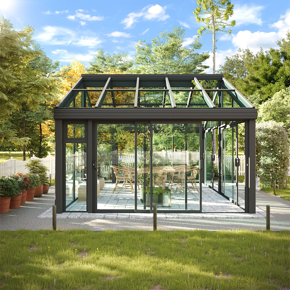 Ett uterum i aluminium är så nära underhållsfritt som det kan bli. Det här är ett exklusivt, fristående uterum för användning från tidig vårsol till riktigt kalla höstkvällar. Det traditionella sadeltaket utan takutsprång ger ett modernt och avskalad uttryck. Med olika val för kulör och tak har du möjlighet att anpassa uterummet.