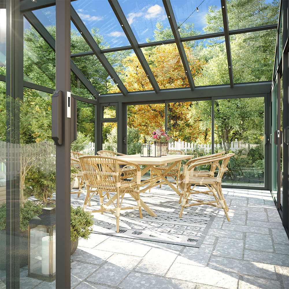 Ett svarttonat glastak ger dig samma exklusiva uttryck som ett transparent, men minskar både ljustransmissionen (hur mycket ljus som släpps in) och solenergitransmissionen (hur mycket av solens värme som kommer in). Det är både estetiskt snyggt och erbjuder höga nivåer av naturligt ljus för en behaglig komfort i ditt uterum. Taket upplevs framförallt mörkare utifrån än inifrån.