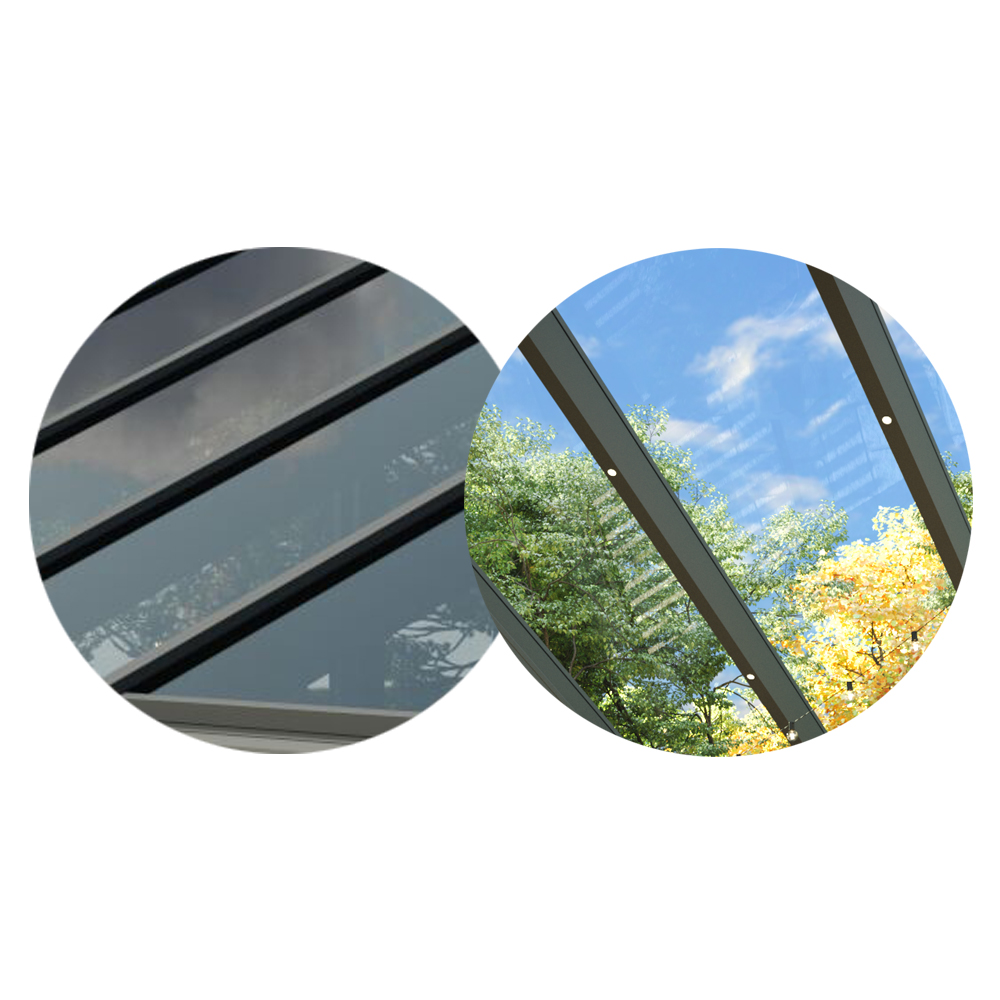 Ett svarttonat glastak ger dig samma exklusiva uttryck som ett transparent, men minskar både ljustransmissionen (hur mycket ljus som släpps in) och solenergitransmissionen (hur mycket av solens värme som kommer in). Det är både estetiskt snyggt och erbjuder höga nivåer av naturligt ljus för en behaglig komfort i ditt uterum. Taket upplevs framförallt mörkare utifrån än inifrån.