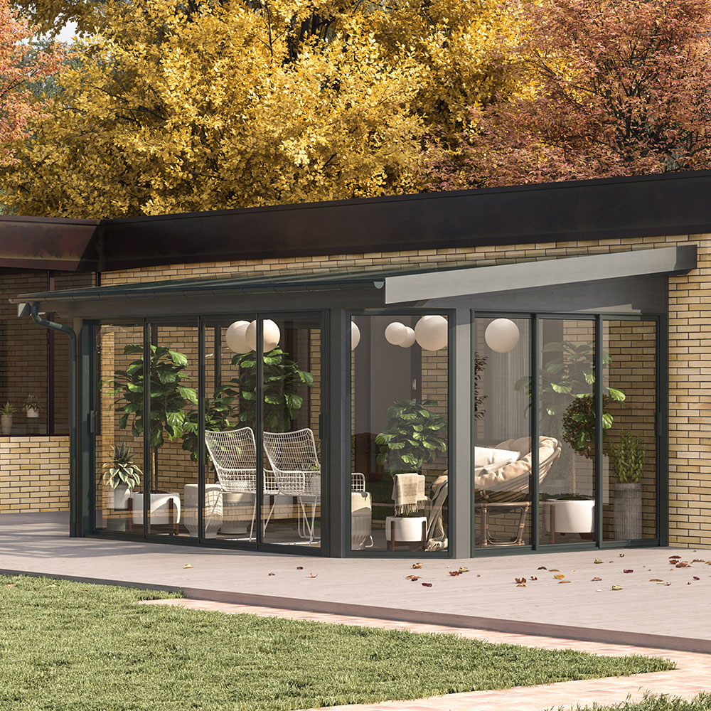 Fira är idag ett av våra mest sålda uterum som passar i många olika miljöer. Tack vare den stilrena designen och de många valmöjligheterna kan du anpassa ditt fasadmonterade uterum så att det passar dina behov och önskemål. Anpassa design, storlek, färg och isolerförmåga och njut av ljusinsläpp, rymd och utemiljö oavsett säsong.