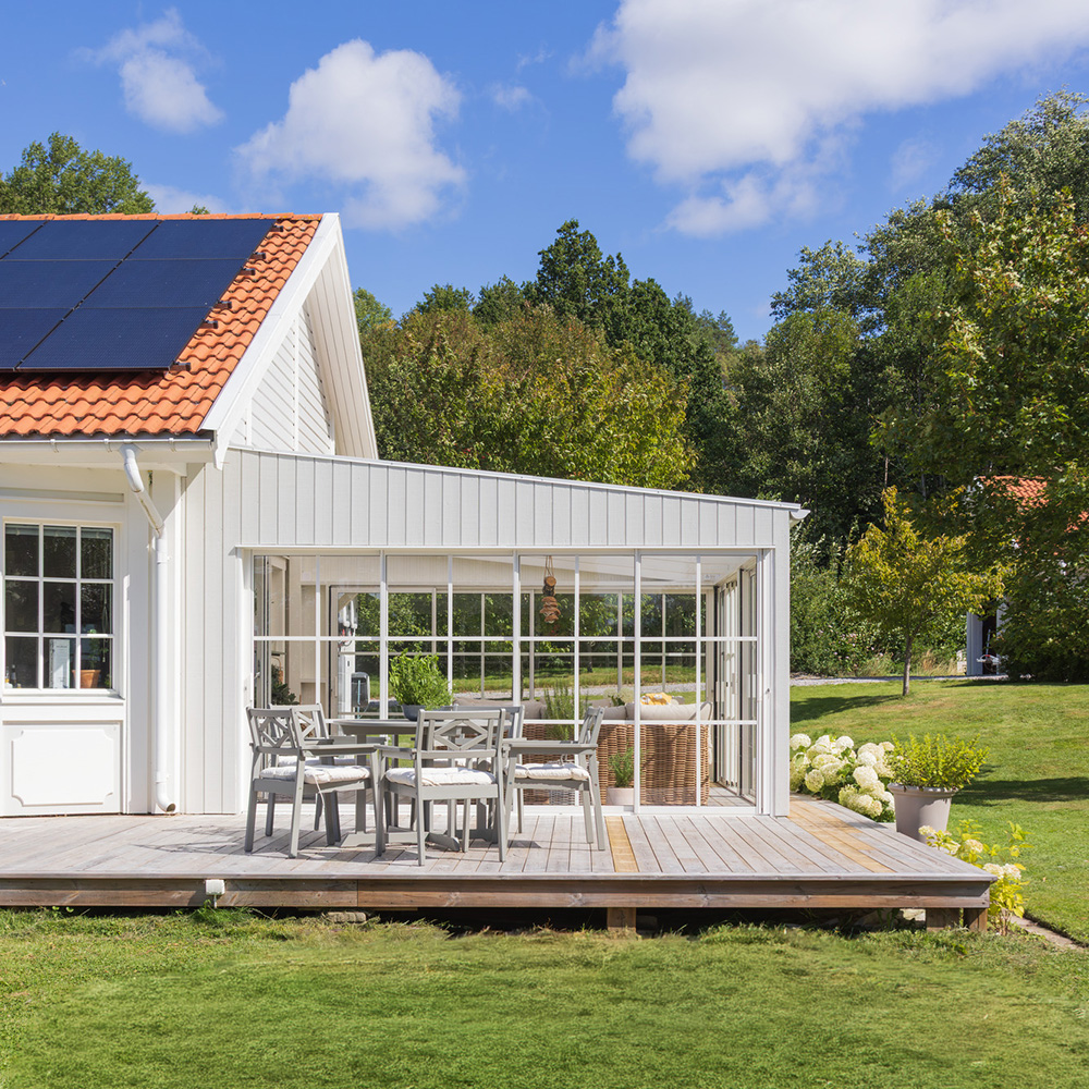 Njut av uterummet större delen av året. Från mars till november får du ett bättre isolerat uterum. Uterumspartier med isolerkassett: Isolent skjutdörrspartier Tak: 32 mm kanalplasttak