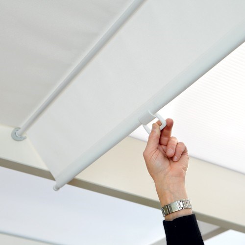 Skuggtaksrullgardinen erbjuder behaglig skugga och skönare klimat när det är varmt ute, men även isolering vid kallt väder. Minskar värmeinstrålningen med ca 55%. Isolereffekten är 40%.