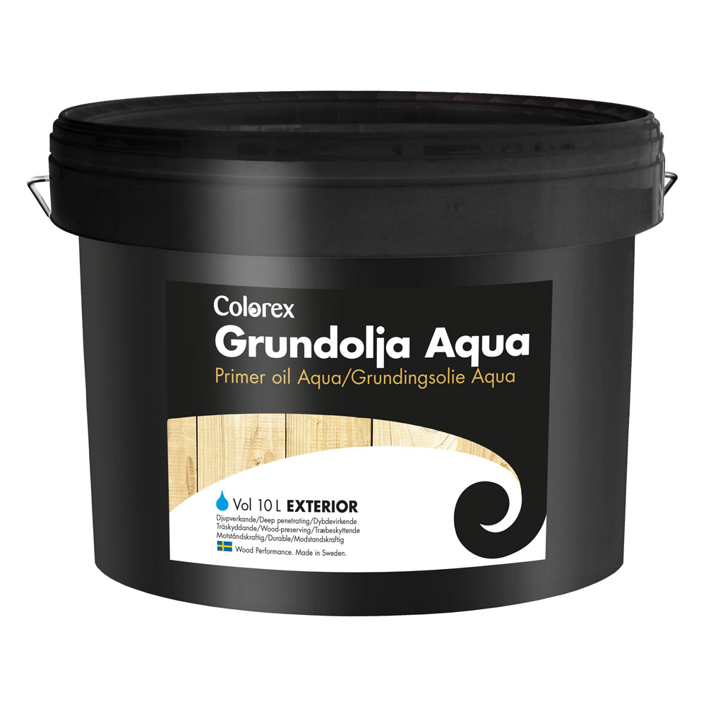 Colorex Grundolja Aqua Djupverkande fasadgrundolja för ny- och ommålning av trä utomhus. Fungerar som grundskikt i målningssystem och motverkar sprickbildning. Vid kombination med Grund II H2O och toppfärg ges mångårigt motståndskraftigt skydd mot fukt och oönskad tillväxt.