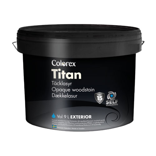 Colorex Titan Fasadfärg Colorex Titan är en självrengörande och lättstruken fasadfärg som ger ett extremt slitstarkt resultat och högsta glans- och kulörstabilitet. Speciellt framtagen för nordiskt klimat med en ny unik hybridkombination av polyuretanalkyd och akryl får ytan en suverän flexibilitet, minimal vattenupptagning samt högsta smutsavvisning och mögelskydd även på skuggiga partier. Innehåller biociderna IPBC, OIT och Diuron som skyddar mot angrepp av mögel och alger. Titan kan appliceras på nytt trä eller träytor som tidigare målats med oljefärg eller akrylat. Lasyren ger en halvblank finish och passar utmärkt för målning av alla typer av träytor utomhus, såsom fasad, staket, carport och förråd.