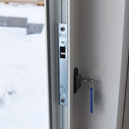 Isolerkassett med härdat glas tillsammans med brutna köldbryggor i dörr, karmsidor och räls.