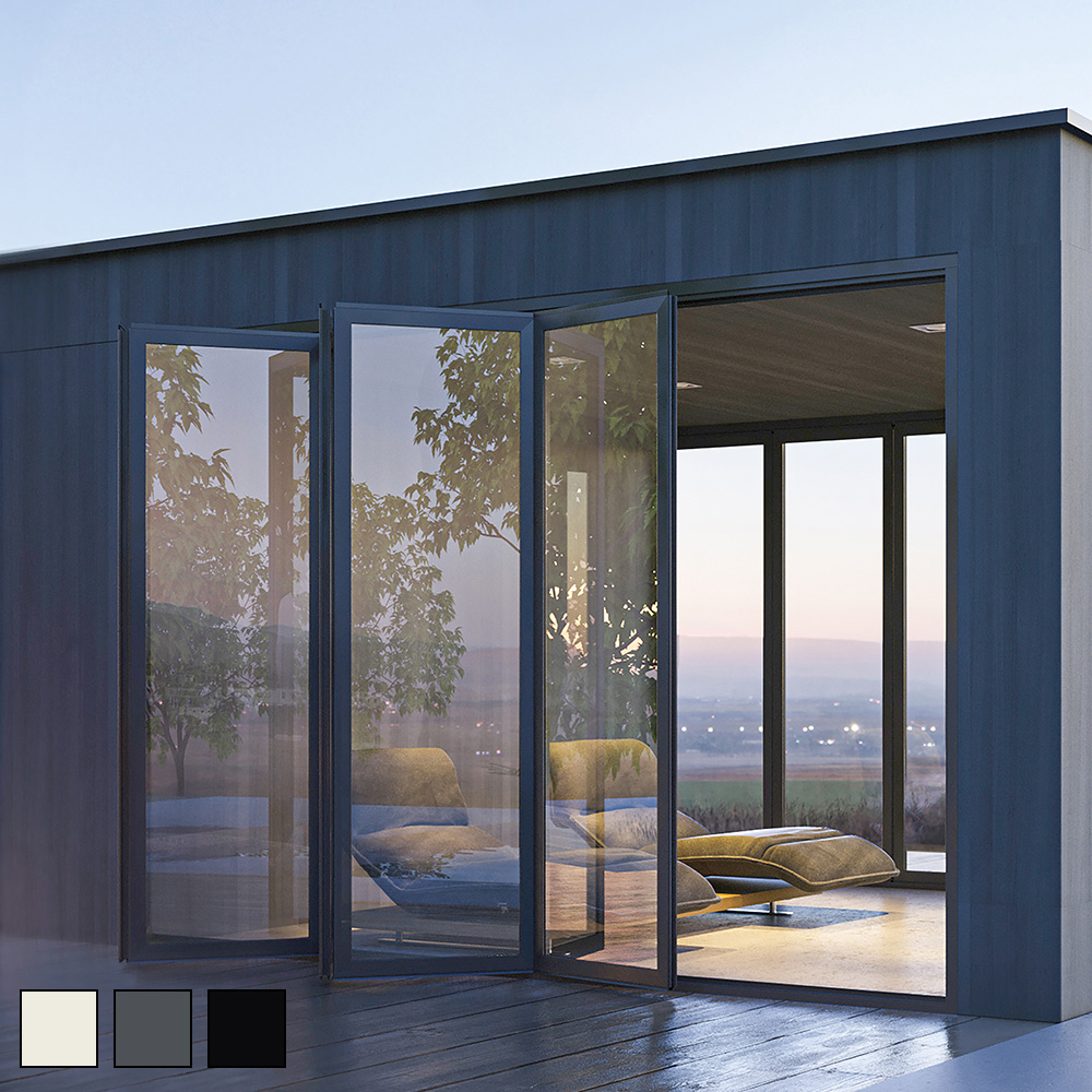 Vikdörrarna är 199,5 cm höga och finns i bredder från 150 cm upp till 410 cm. Beroende på den bredd du väljer får du 2, 3 eller 4 luckor. Välj mellan kulörerna vit, mattsvart och antracitgrå.