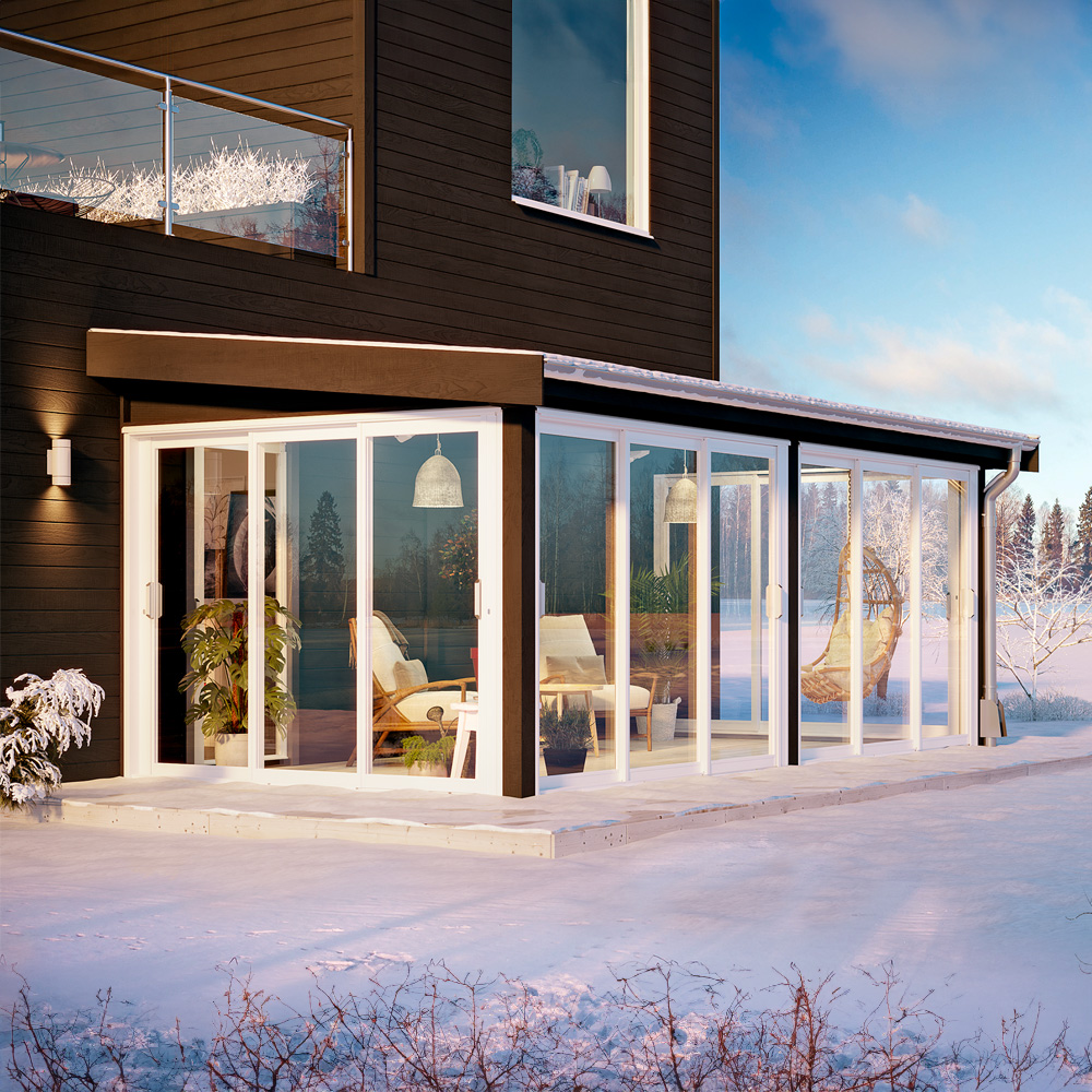 Finns med 2 och 3-luckor, i bredder från 140 - 410 cm. Anpassa ditt inglasade uterum efter dina egna önskemål och komplettera med fasta partier i samma serie. Välj mellan vita eller svarta partier. De svarta partierna är lackade i en strukturlack som är både mer hållbar och ger ett snyggare resultat.