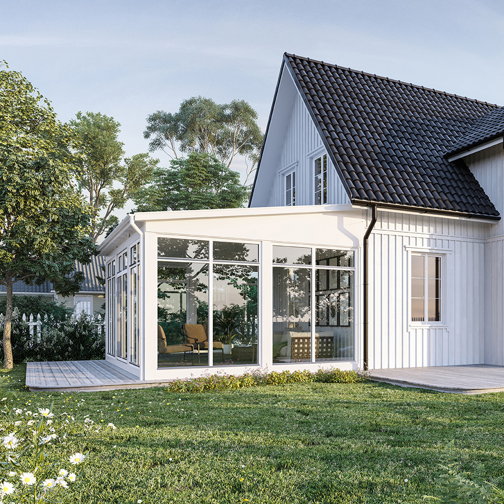 Arkitektritade Känna passar utmärkt till klassiska villor och hus i modernare stil såväl som till de flesta andra hus eftersom det har ett smidigt pulpettak. Känna är en paketlösning med allt du behöver för att skapa din dröm om större ytor i hemmet!