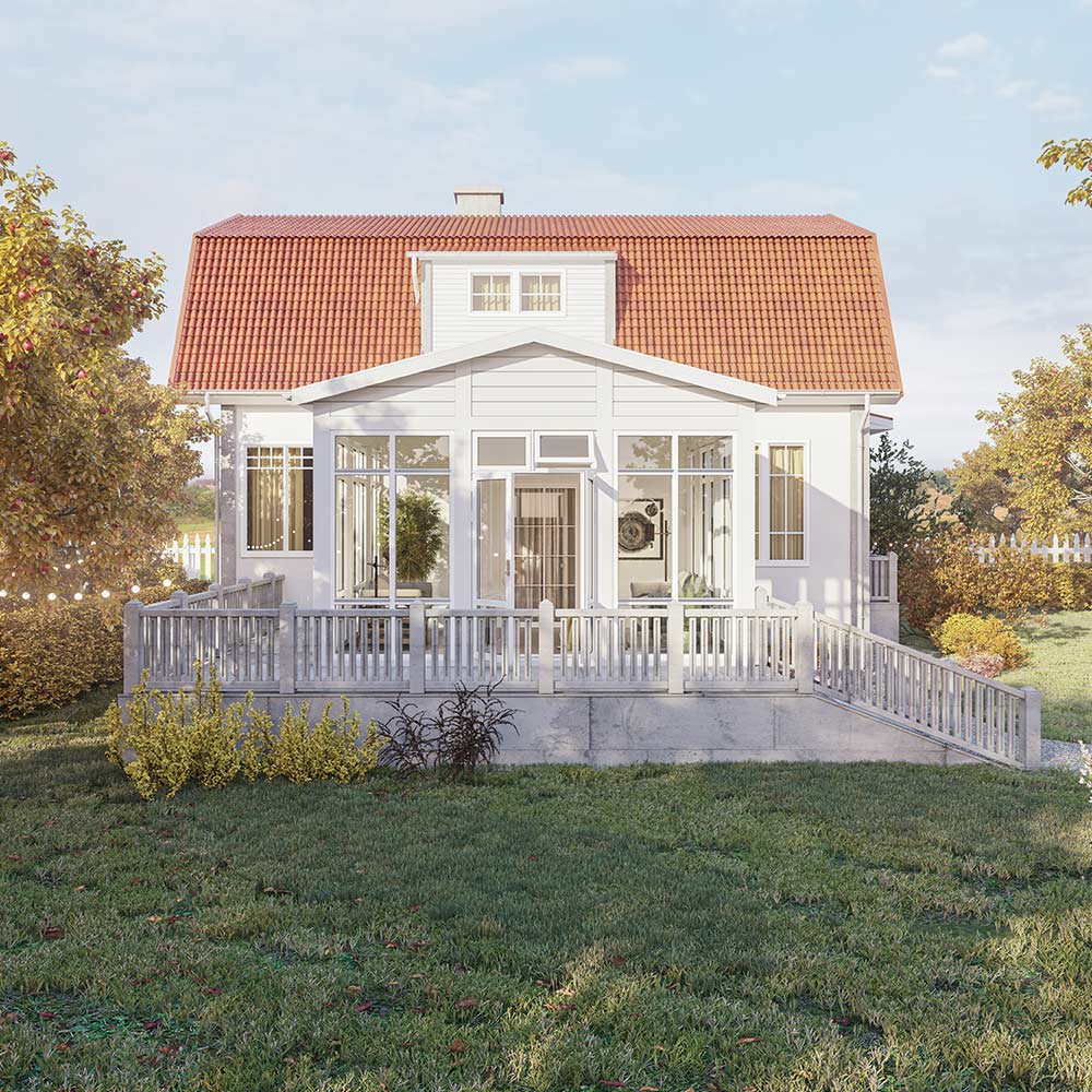 Andas ut och njut av lugnet i din nya veranda med en kopp kaffe samtidigt som du tittar ut över trädgården. Denna bekväma dröm kommer ge dig ett extra rum och mer plats för gemenskap.