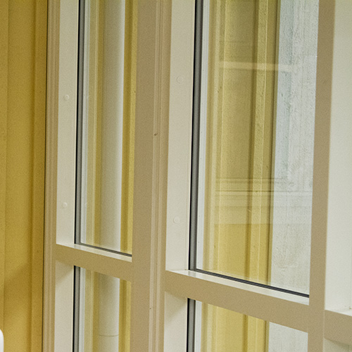 Samtliga glas är av säkerhetsglas förutom överfönstren. Alla karmar runt glaspartierna är i fingerskarvad impregnerad och vitmålad furu. Karmmåtten är 45 x 116 mm. Det ingår droppbleck till samtliga fönsterpartier, dock ej fotplåtar eller fönsterplåtar.