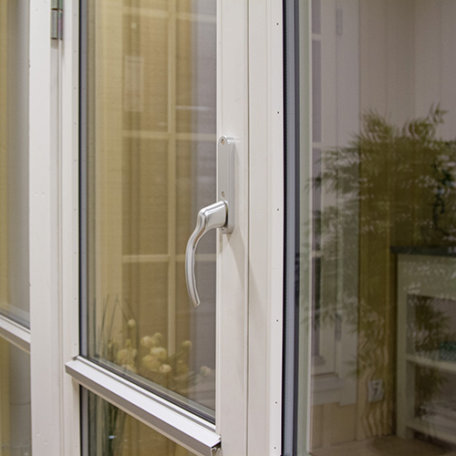 På fönsterdörren/pardörren är det vänster dörr utifrån sett som är gångdörr. Det är en inbyggd dörrbroms på gångdörren (ej på anslagsdörren). Invändig panel, innertak samt lister ingår ej.