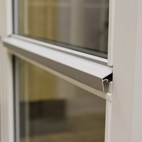 Samtliga glas är av säkerhetsglas förutom överfönstren. Alla karmar runt glaspartierna är i fingerskarvad impregnerad och vitmålad furu. Karmmåtten är 45 x 116 mm. Det ingår droppbleck till samtliga fönsterpartier, dock ej fotplåtar eller fönsterplåtar.