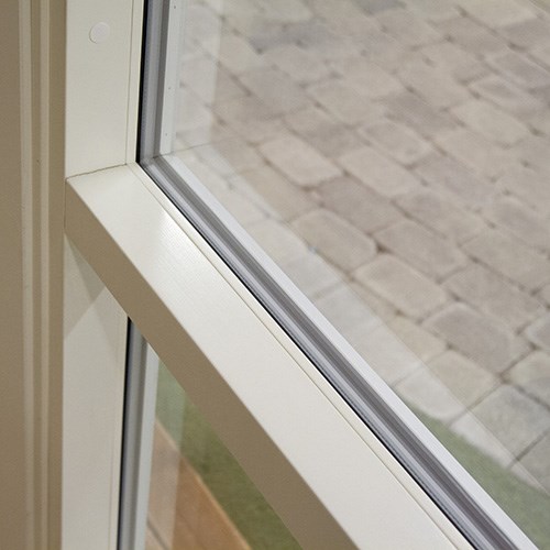 Samtliga glas är av säkerhetsglas förutom överfönstren. Alla karmar runt glaspartierna är i fingerskarvad impregnerad och vitmålad furu. Karmmåtten är 45 x 116 mm. Det ingår droppbleck till samtliga fönsterpartier, dock ej fotplåtar eller fönsterplåtar.