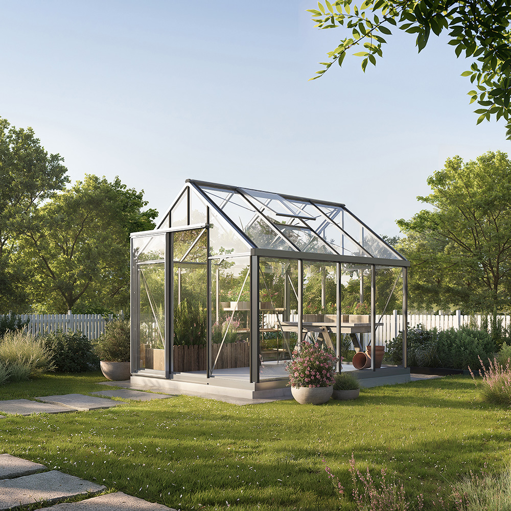 Välj växthus i obehandlad aluminium eller victorian med svart pulverlackering. Nockdekorationen ingår inte utan är ett tillval som finns för de svarta modellerna.