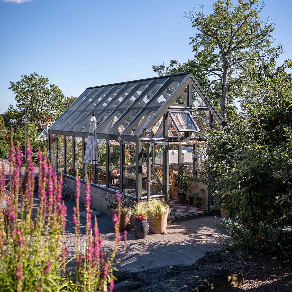 Med vackert gråbehandlat trä och härdat glas kommer orangeriet Emilia förgylla din trädgård.
