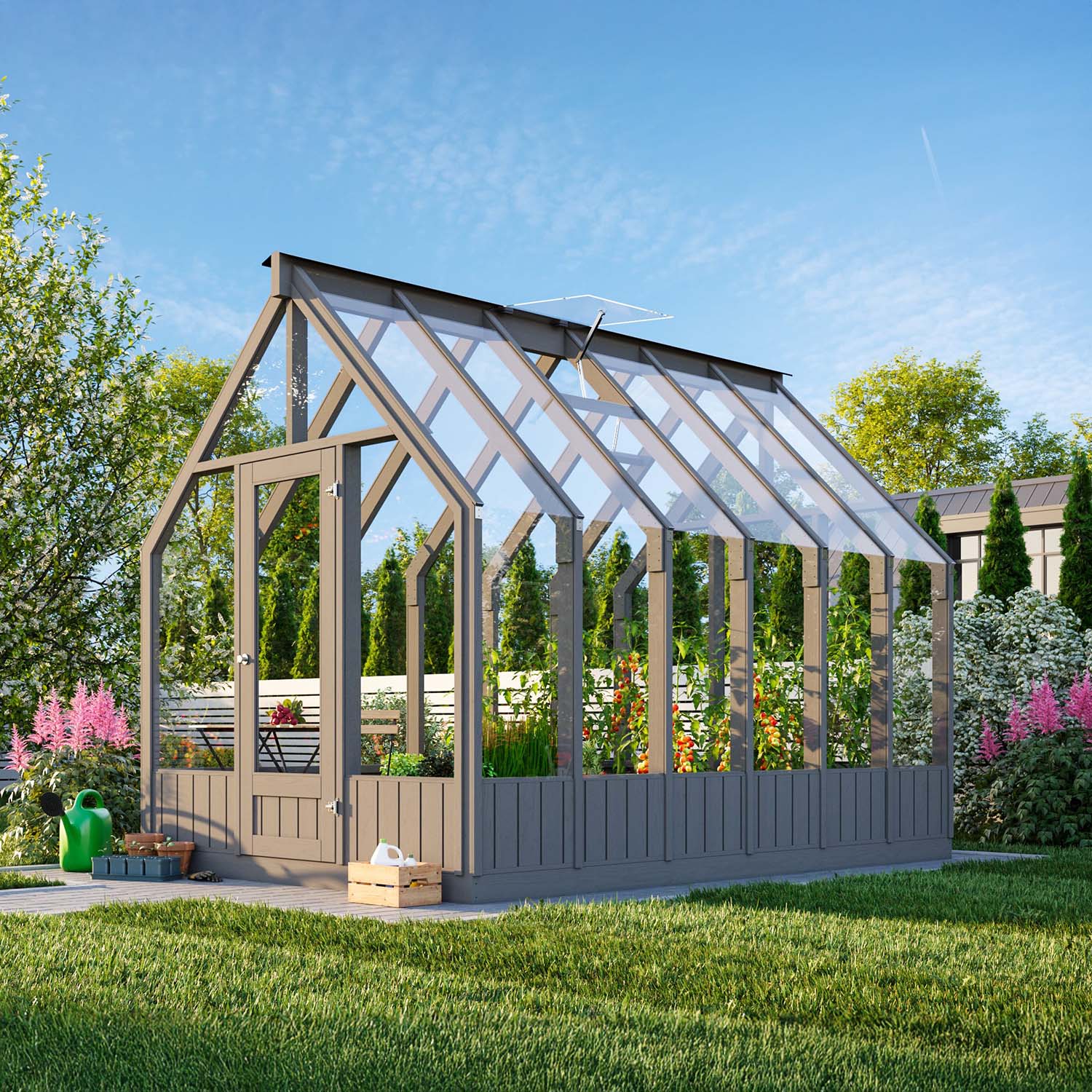 Med vackert gråmålat trä och härdat glas kommer växthuset Emilia förgylla din trädgård.