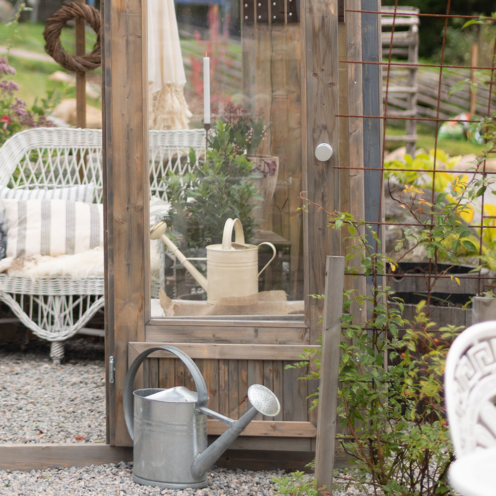För Emilia träväxthus 5,9 m² och 8,7 m² kan du välja till en praktisk förrådsdel som blir den ultimata förlängningen av ditt växthus. Förrådet har samma snygga gråbehandlade yta som växthuset och har plats för alla dina trädgårdsredskap.