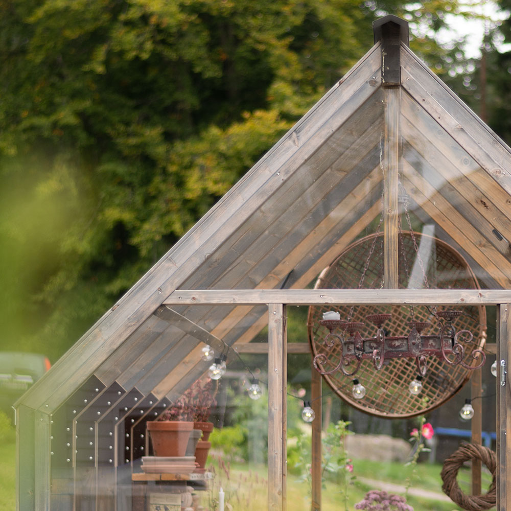 Med vackert gråbehandlat trä och härdat glas kommer växthuset Emilia förgylla din trädgård.