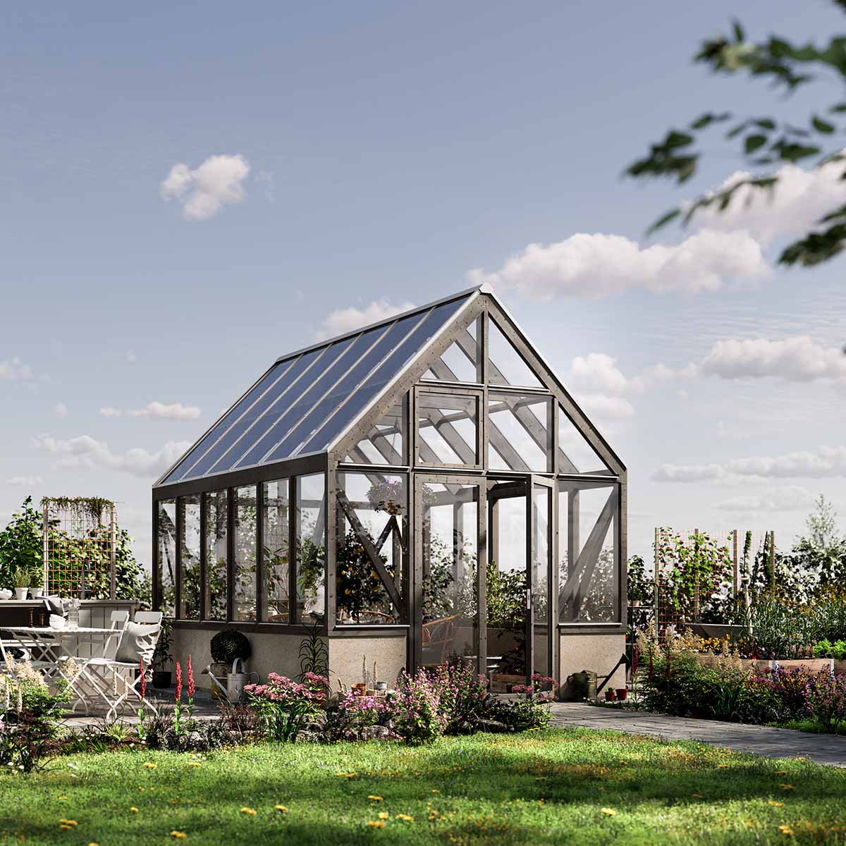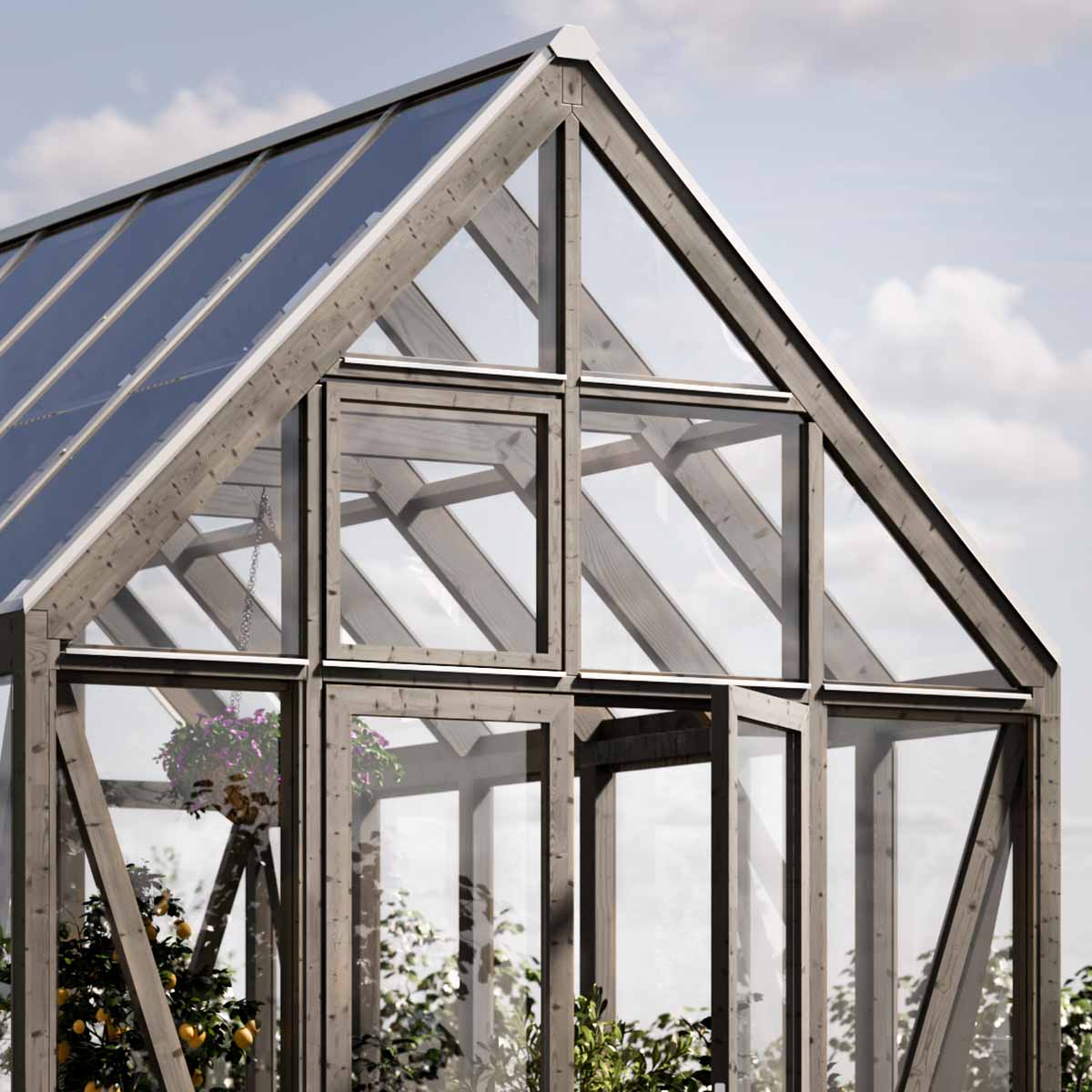 Växthuset är gjort av gedigna limträstommar i doppimpregnerad gran som ger dig möjlighet att välja grundfärg och täckfärg själv. Ska den gifta eller skilja sig från ditt hus? Måla det i vilken kulör du vill. Allt beror på vilken effekt du vill ha.
