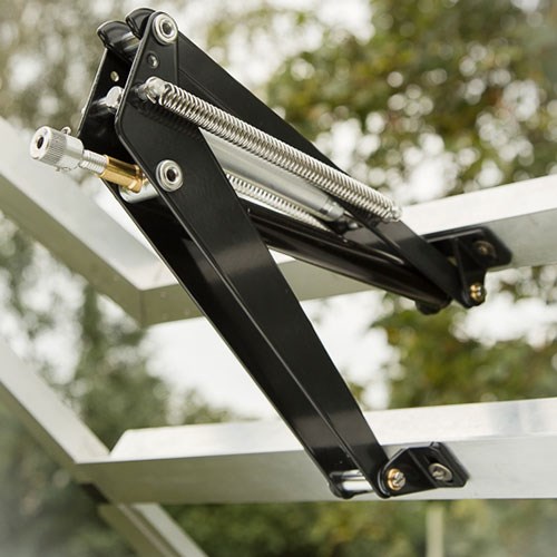 Denna kraftfulla fönsteröppnare i aluminium är utrustad med stötdämpare för att förhindra att fönstret slits upp av blåst och starka vindar. På öppnarens båda sidor monteras två kraftiga fjädrar som gör att öppnaren även klarar stora fönster i alla slags väder.