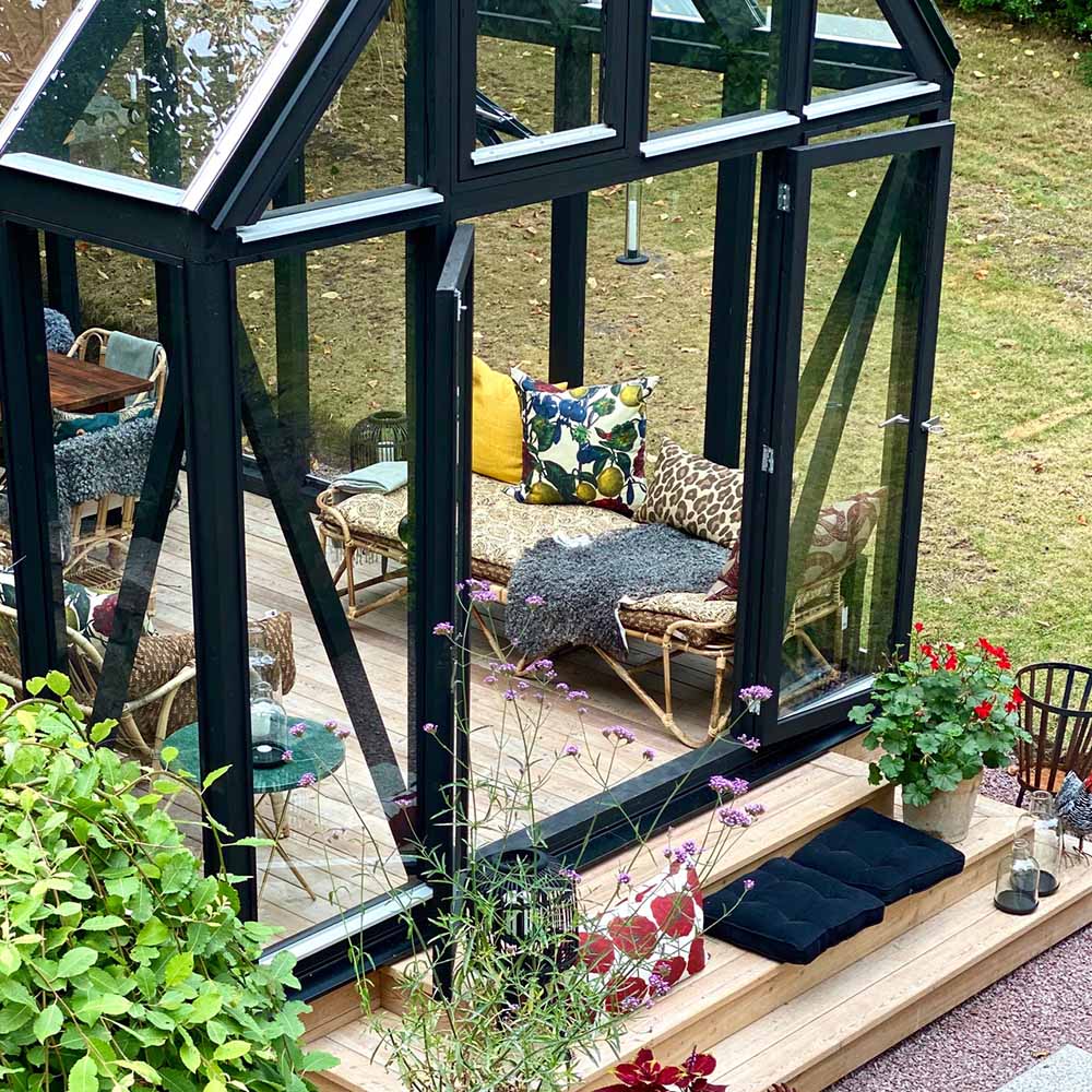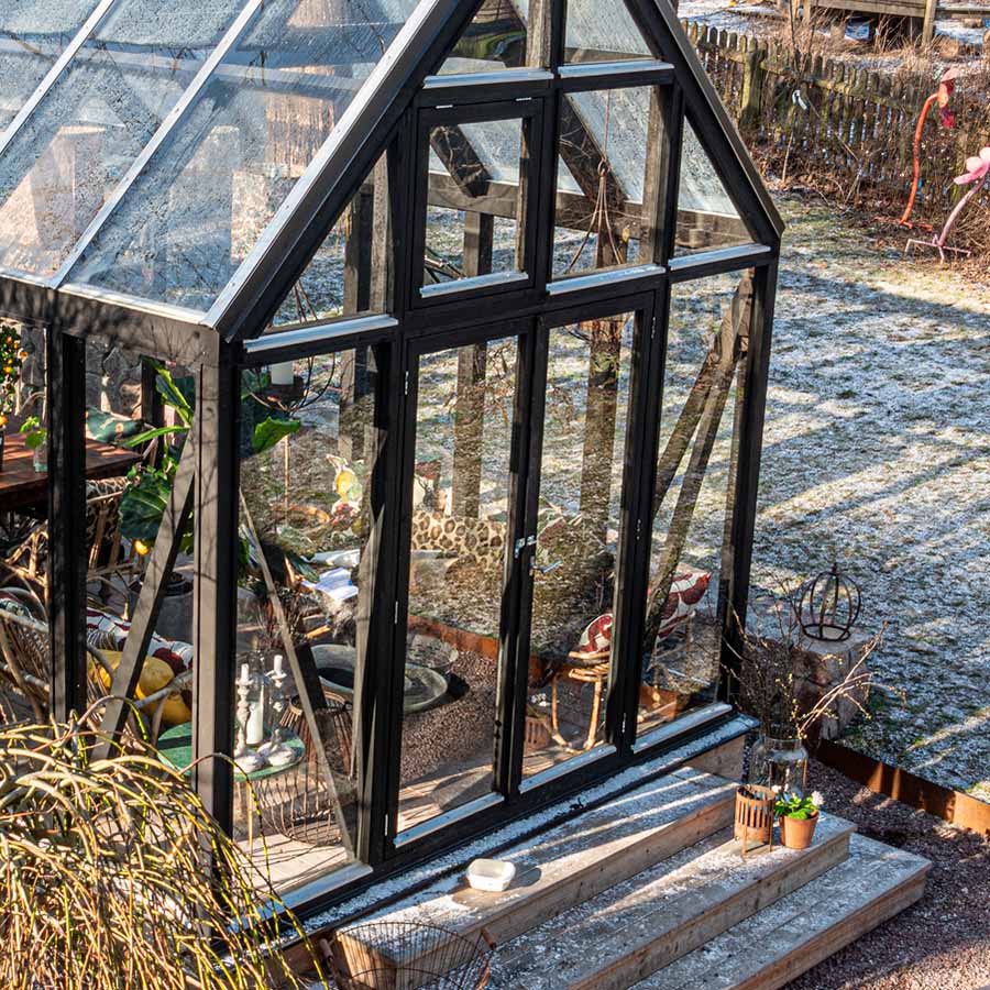 Dörren kan placeras fritt i växthuset och monteras både på kortsida och långsida. Det ger dig full flexibilitet att anpassa lösningen efter din trädgård och hur du använder ditt växthus. Dörrsatsen är särskilt framtagen för Växa utan mur och innehåller alla delar som behövs för montering.