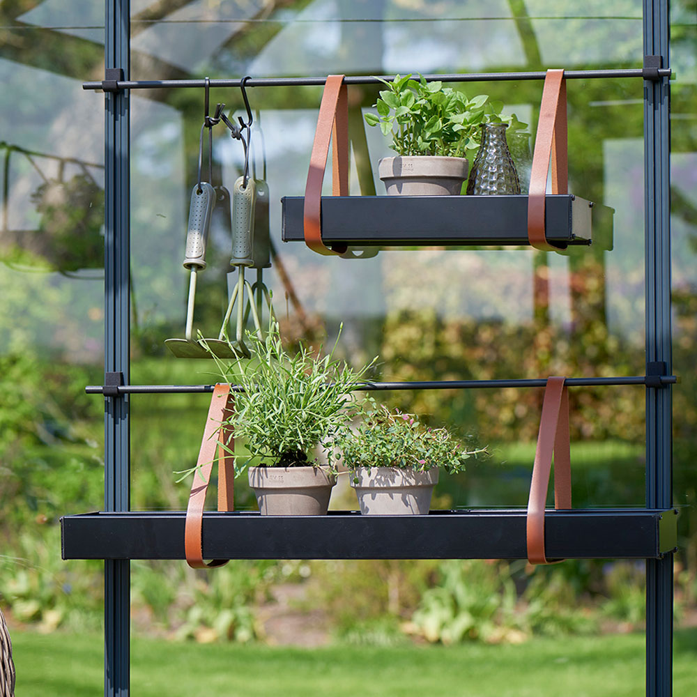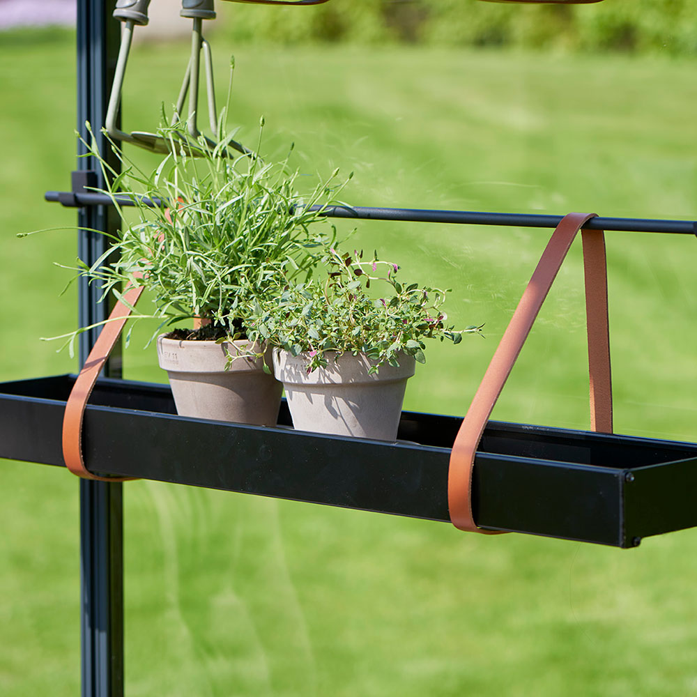 Piffa till ditt växthus med en dekorativ hylla som hängs upp med snygga läderband.