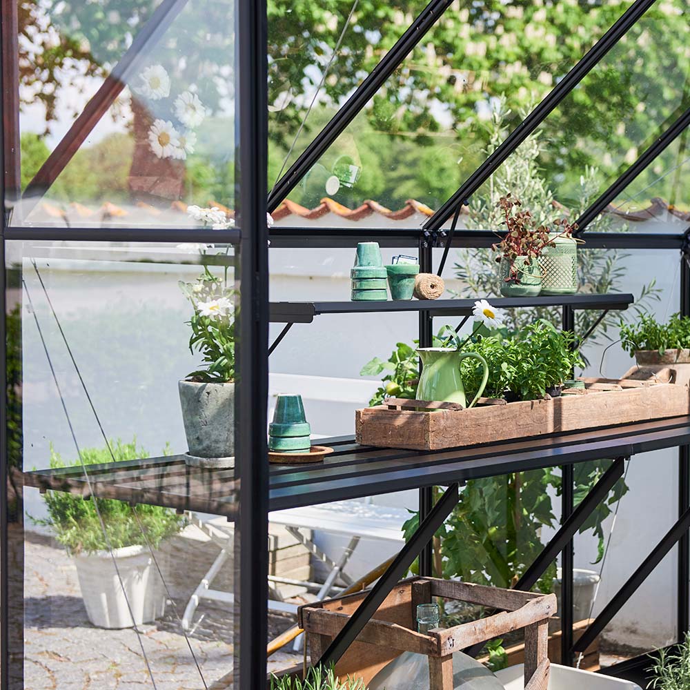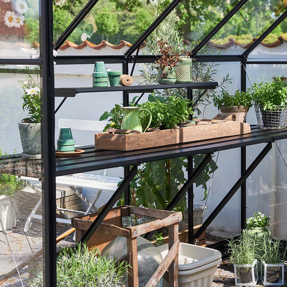 Välj till ett smart, integrerat växthusbord som går från gavel till gavel. Det ger dig en stabil och ordentlig avlastningsyta samt förvaringsplats åt dina krukor och redskap. Bordet fungerar även utmärkt som planteringsbord när du vill sköta om alla dina växter på en bekväm arbetshöjd.