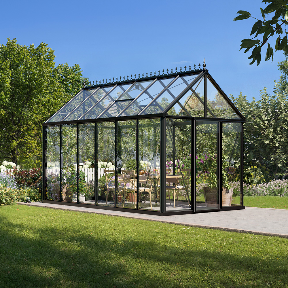 Välj växthus i obehandlad aluminium eller victorian med svart eller mörkgrön pulverlackering. Nockdekorationen ingår inte utan är ett tillval som finns för de svarta och gröna modellerna.
