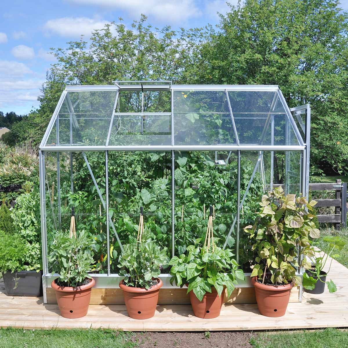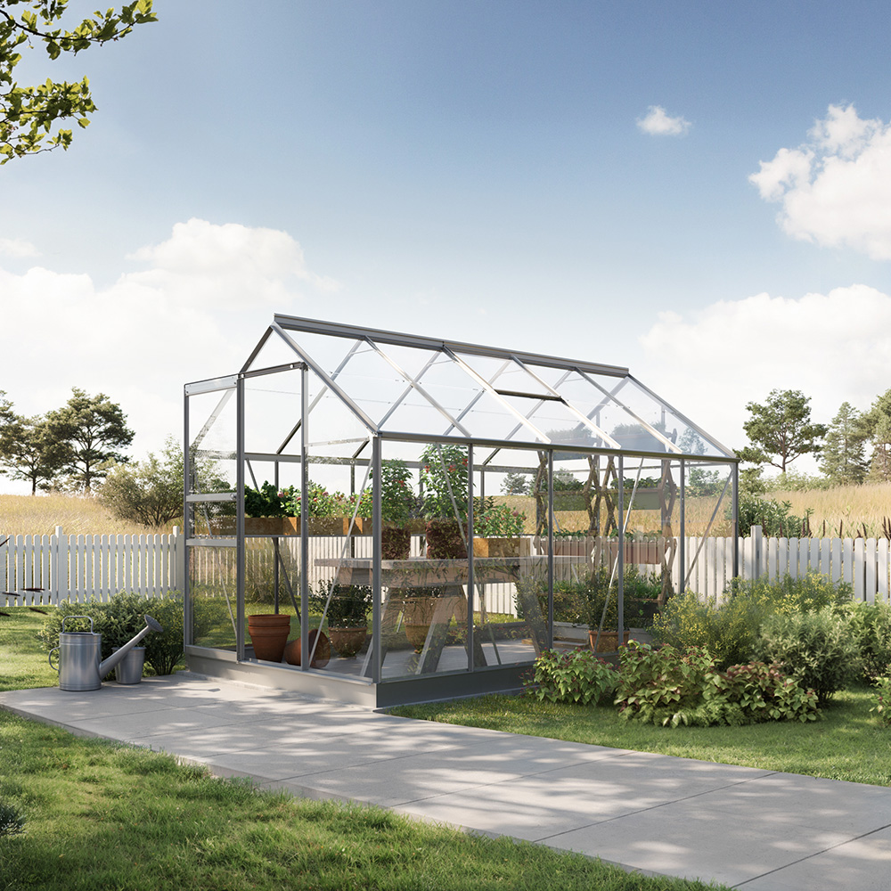 Den klassiska formen gör växthuset lätt att placera i trädgården, och skjutdörren i gaveln är smidig att använda utan att kräva extra svängutrymme. Takfönster med manuell öppning och integrerade hängrännor ingår, så att du får en genomtänkt och funktionell helhet redan från start.