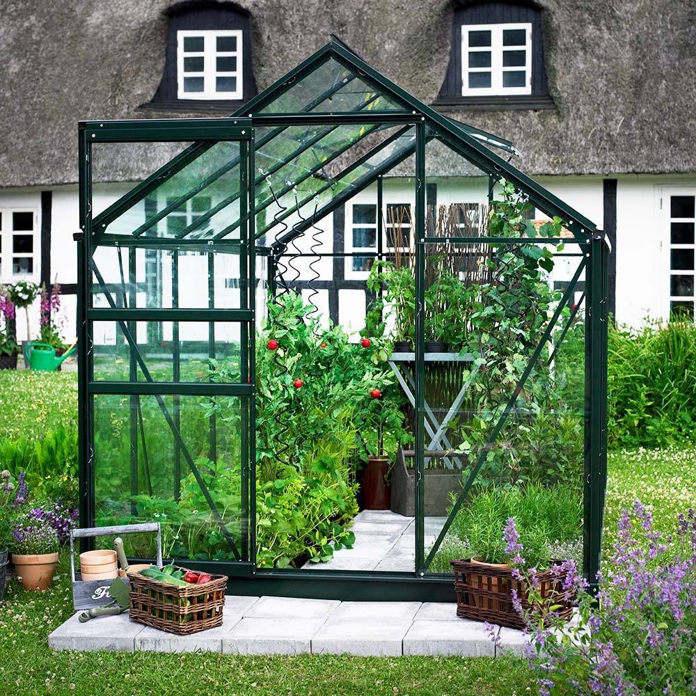 Du får en generös takfotshöjd även på denna mindre modell och dörren löper friktionsfritt fram och tillbaka. Växthuset Bruka i grönt kommer med en hård och tålig pulverlackering. Med detta växthus ingår ventilationsfönster med manuell manövrering och integrerade hängrännor. Mer exakta mått på växthuset hittar du under Monteringsanvisningar.