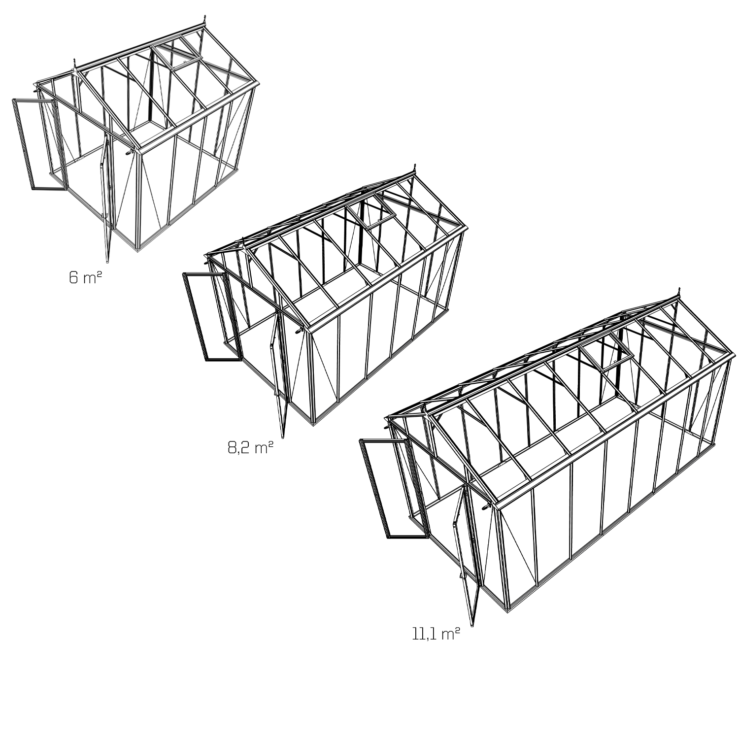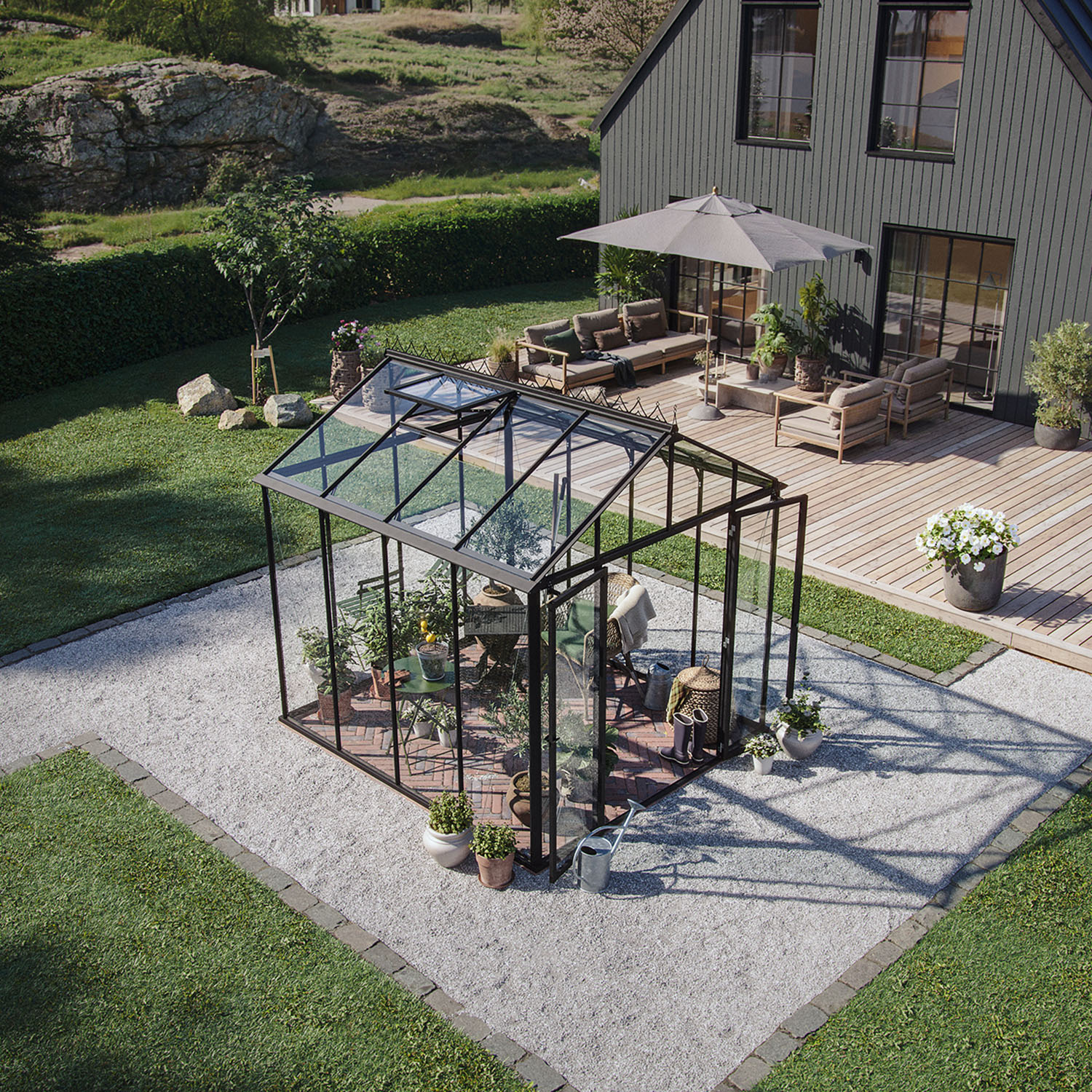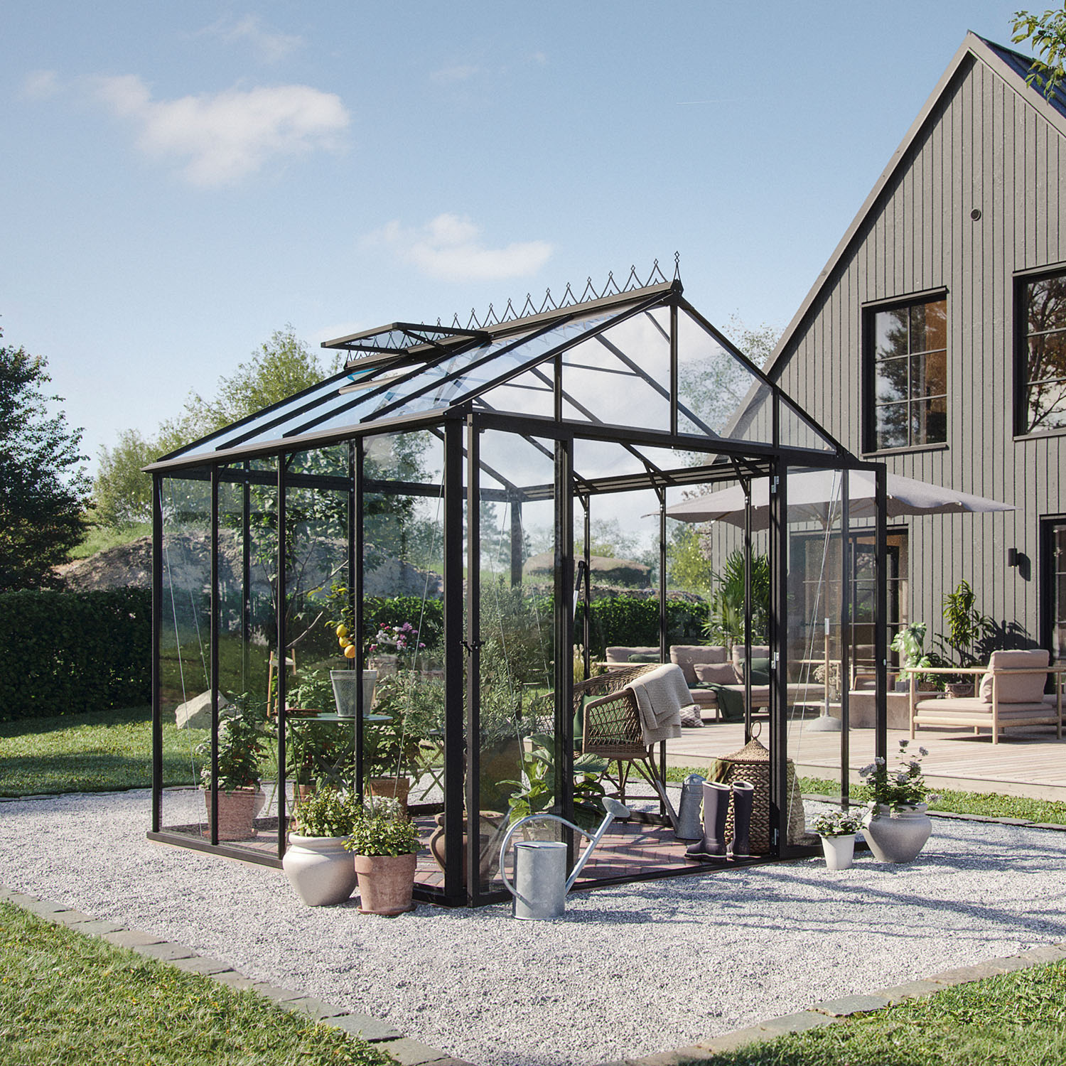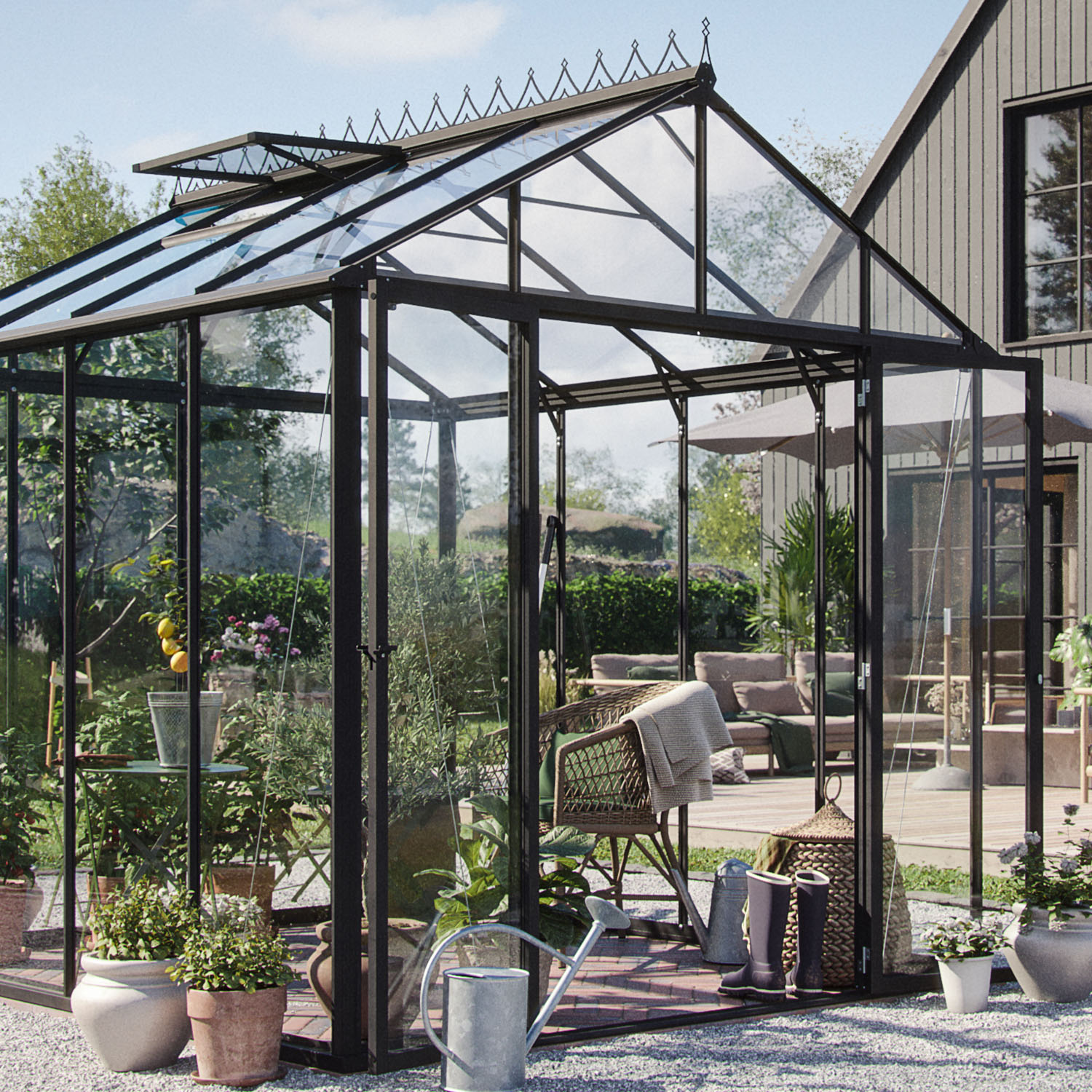 Flora levereras med flera funktioner som förenklar både montering och användning. Ett öppningsbart takfönster ingår i alla storlekar för god ventilation och ett bra klimat för dina växter. Den integrerade sockeln ger en stabil grund redan från början, och de specialdesignade gummilisterna håller glaset stadigt på plats för en tystare och tryggare konstruktion. Flora har en bred dubbeldörr där lås och nycklar ingår som standard.
