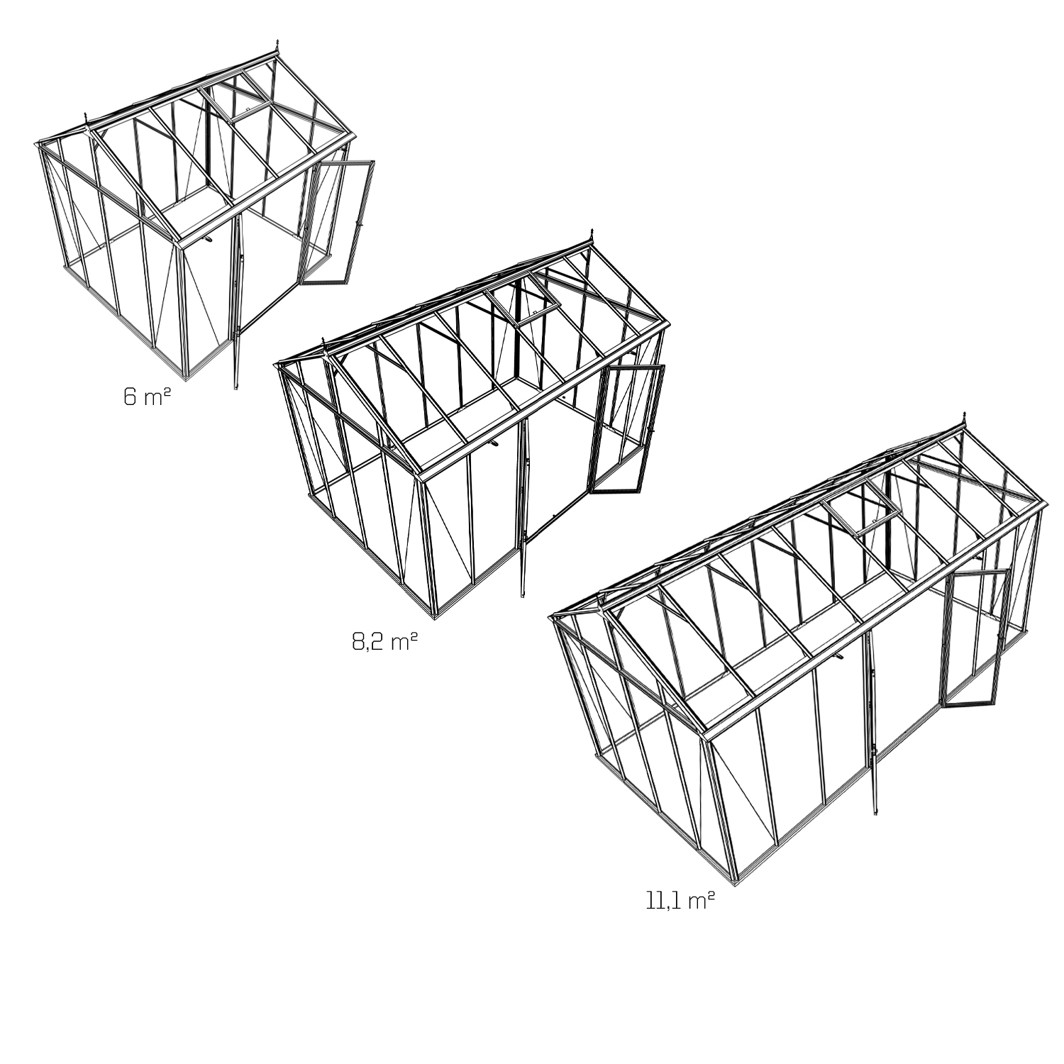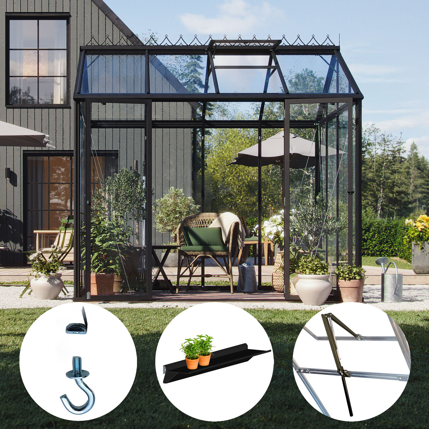 Dessutom kan du göra växthuset ännu mer personligt med tillbehör som takfönster, hyllor, automatisk fönsteröppnare och upphängningar för dina växter.