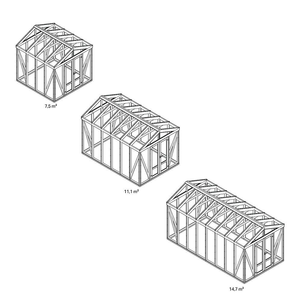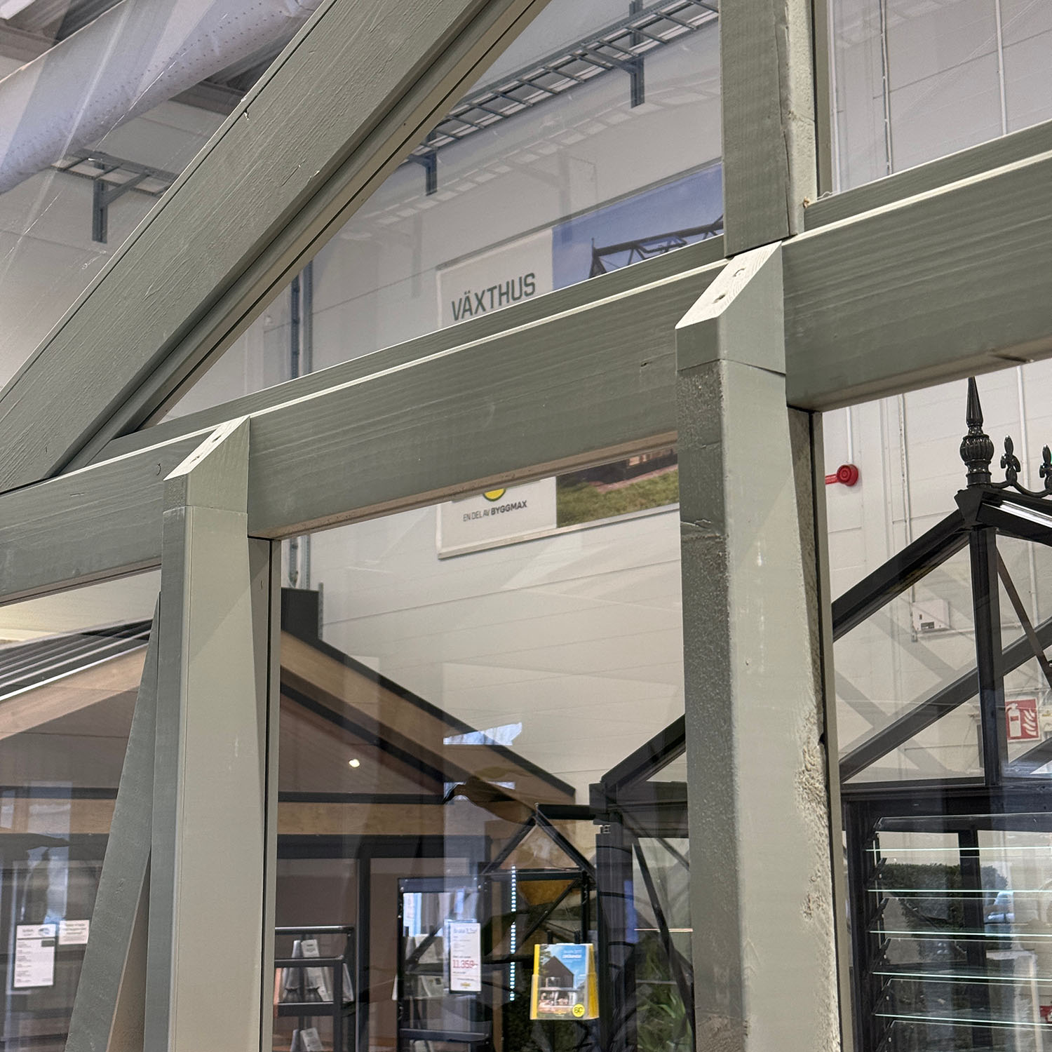 Alla bärande delar av växthuset Linnea är av C24-klassat konstruktionsvirke vilket innebär att de har hög hållfasthet och klarar en mycket hög belastning. Delarna har märken och spår efter hyvling och sågning.