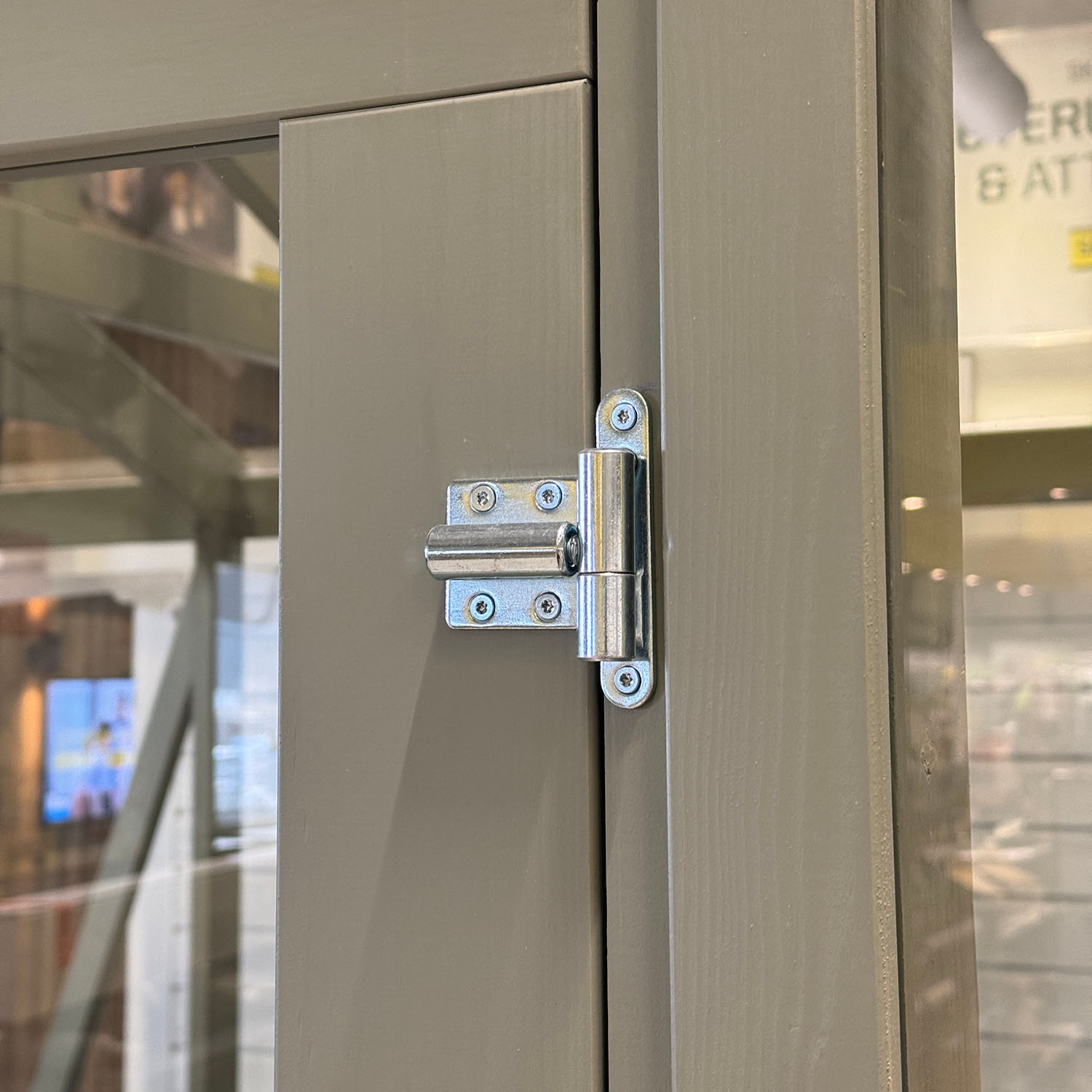 Med sin slimmade design får materialvalen verkligen ta plats. Antalet delar som inte är av trä eller glas är minimalt, vilket skapar ett vackert helhetsintryck. Växthusets robusta dubbeldörrar ger ett välkomnande intryck och gör det enkelt för dig att hantera dina odlingar. Dörrarna är försedda med ett låsbart handtag.