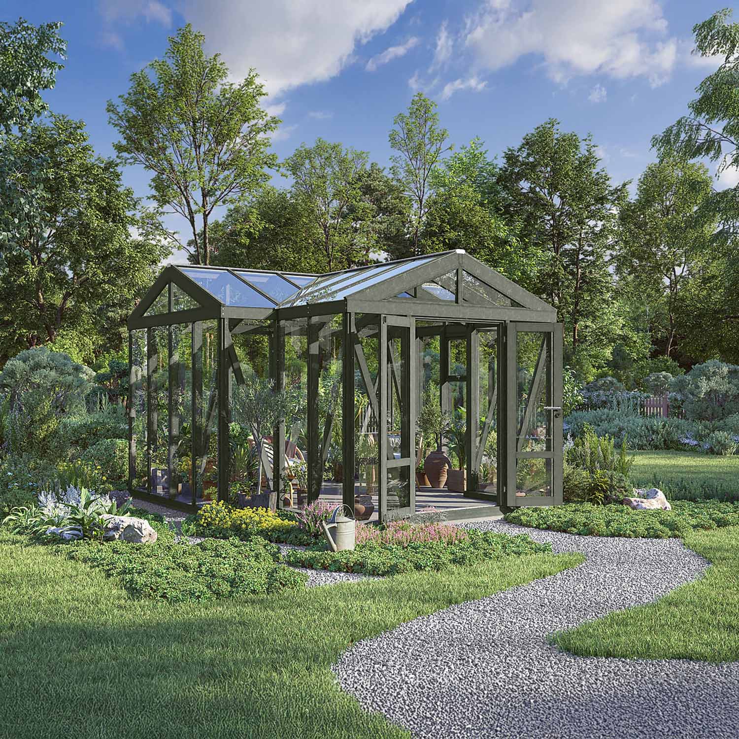 Upplev Linnea Orangeri – ett pampigt och rymligt växthus i klassisk T-form som förenar tidlös design med maximalt ljusinsläpp. Med en färdigmålad trästomme får du både hållbarhet och en vacker finish direkt från start, utan behov av extra behandling.