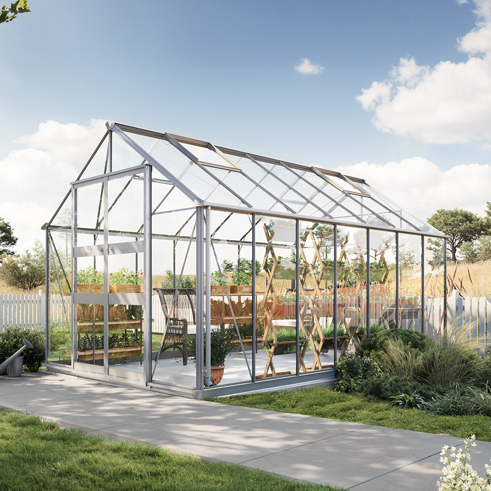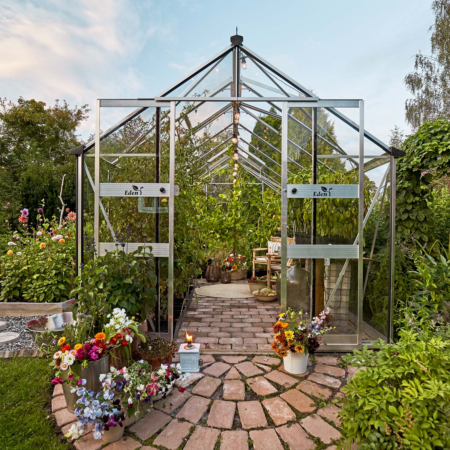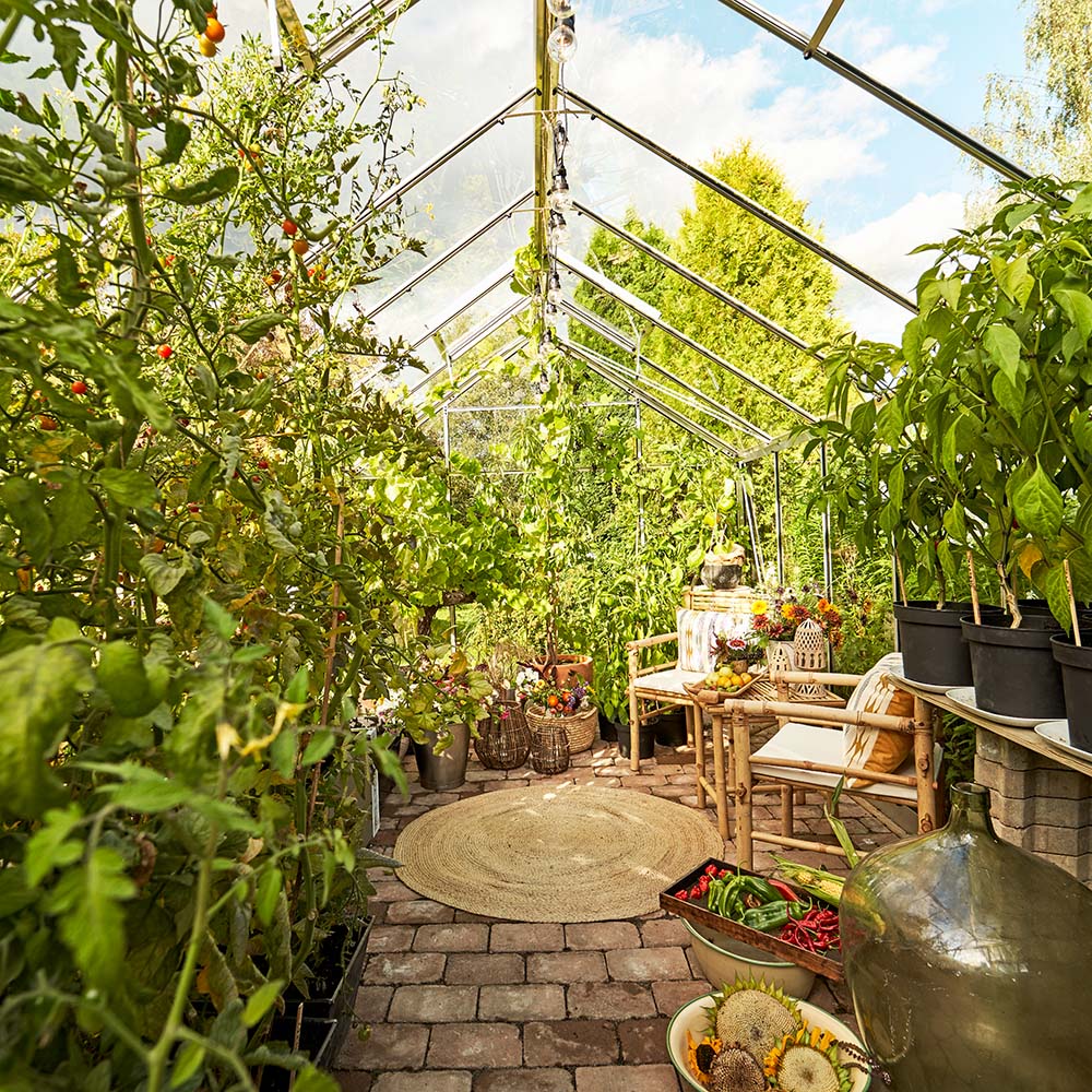 En uppbunden vinranka med några klasar täcker delar av taket, och mitt i växthuset sitter du i en rottingstol omgiven av tomatplantor. Odla är ett prisvärt växthus med generös takhöjd som ger dig plats för olika typer av odlingar. Växthuset har inga trösklar, vilket gör det enkelt att rulla in och ut skottkärran. Dörren löper friktionsfritt i glidskenor fram och tillbaka. Väggarna är gjorda av 3 mm säkerhetsglas.