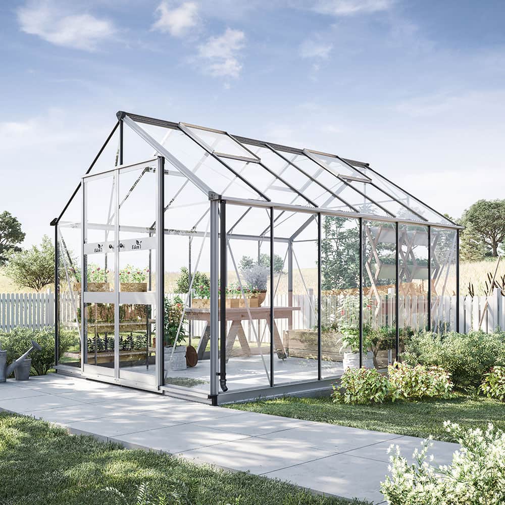 Odla är ett prisvärt växthus med generös takhöjd som ger dig plats för olika typer av odlingar. Växthuset har inga trösklar, vilket gör det enkelt att rulla in och ut skottkärran. Dörren löper friktionsfritt i glidskenor fram och tillbaka. Väggarna är gjorda av 3 mm säkerhetsglas.
