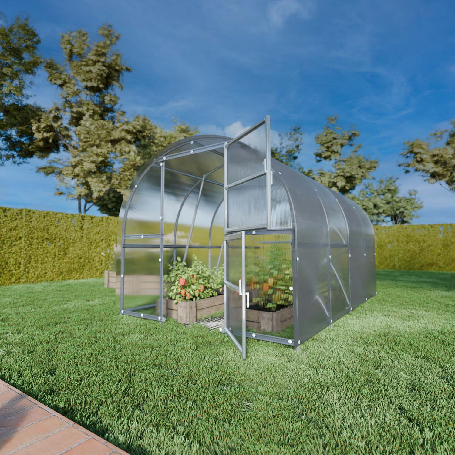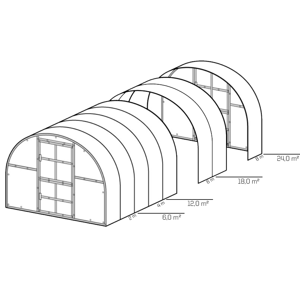 Växthuset har en bredd på 3,0 m och höjd på 2,10 m. Välj mellan storlekarna 6 m² (2x3 m), 12 m² (4x3 m), 18 m² (6x3 m), 24 m² (8x3 m), 30 m² (10x3 m) och 36 m² (12x3 m)