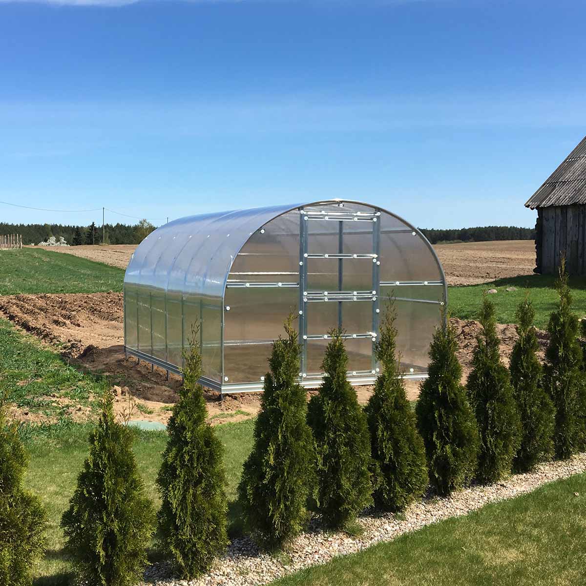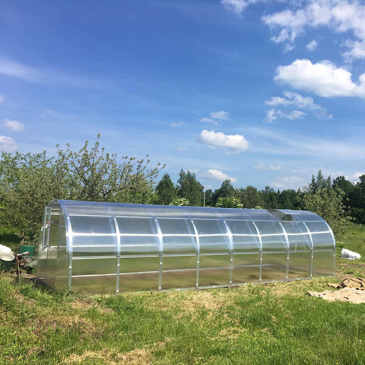 Växthuset har en bredd på 3,0 m och höjd på 2,10 m. Välj mellan storlekarna 6 m² (2x3 m), 12 m² (4x3 m), 18 m² (6x3 m), 24 m² (8x3 m), 30 m² (10x3 m) och 36 m² (12x3 m)