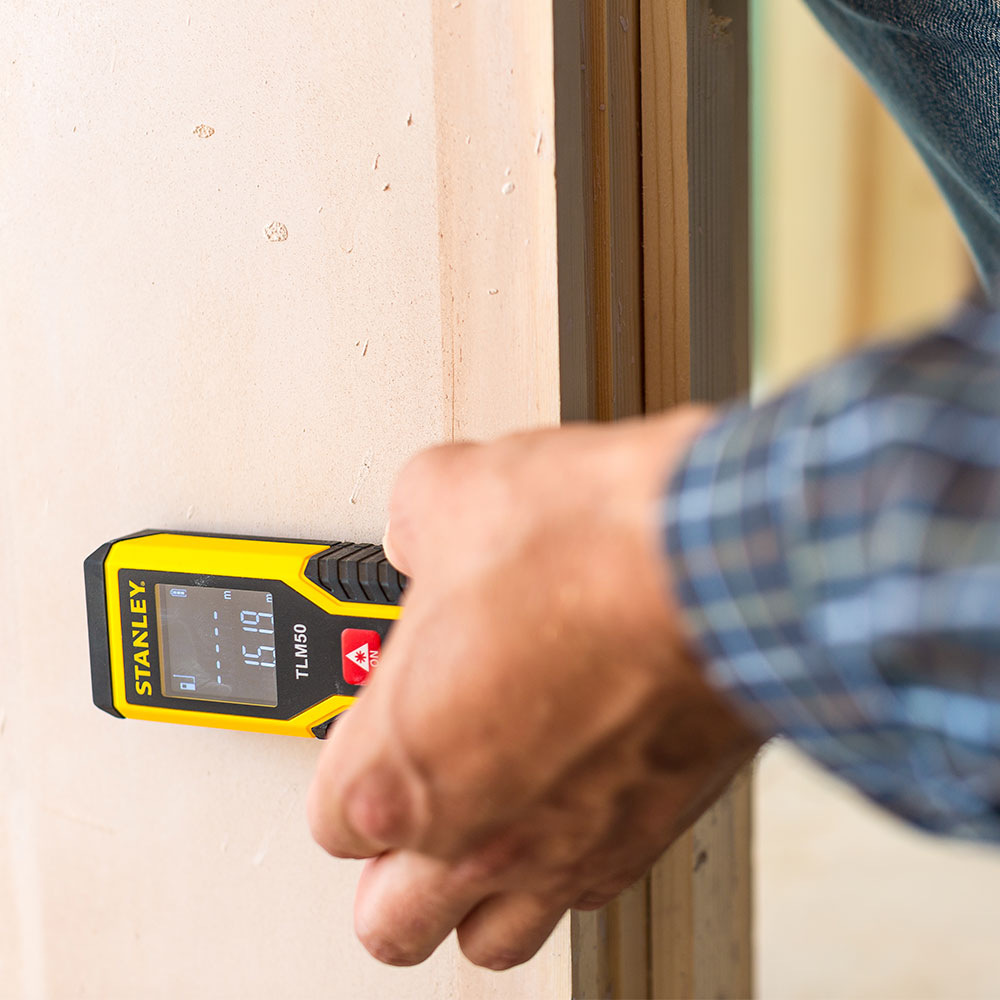 TLM 50 från Stanley är en smidig och lätt avståndsmätare. Eftersom den endast har en knapp är den enkel att använda. Du siktar med laser, trycker av och får avståndet till målet i displayen. Den mäter från 0,15 meter upp till 15 meter med en noggrannhet på ±3 mm. För att spara batteri stängs den av automatiskt.