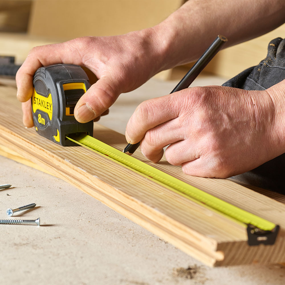 Måttband 8m Stötdämpande gummi Klarar ytor upp till 42° utan att glida av Stor fästkrok Håller sig rakt i 3,05 meter. Artikelnummer: 592018